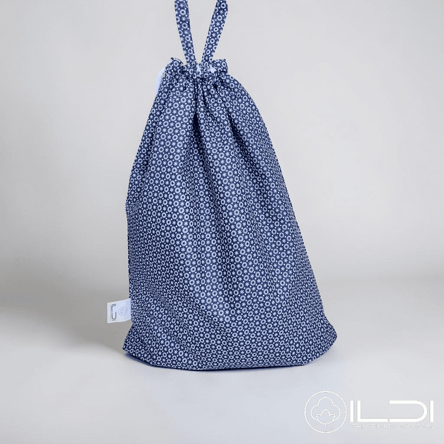 Könnyedén tisztítható, belső impregnált speciális PUL réteget szennyeződés esetén vizes ruhával letörölhető, zsinórral összehúzható, külseje 100% pamutvászonból készül.