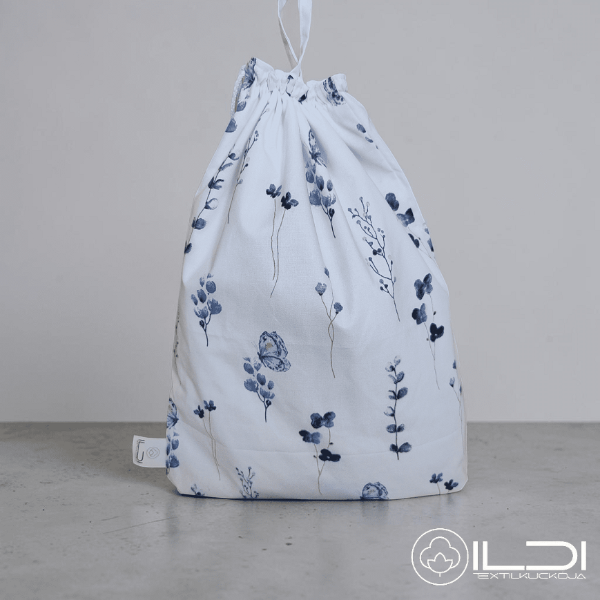 Könnyedén tisztítható, belső impregnált speciális PUL réteget szennyeződés esetén vizes ruhával letörölhető, zsinórral összehúzható, külseje 100% pamutvászonból készül.
