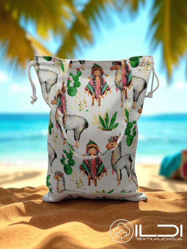 2 rétegből készítettem: egy külső, strapabíró pamut designer vászonból, valamint egy belső, vízlepergető és vízálló PUL anyagból, amely segít bent tartani a nedvességet. Húzózsinórral záródik, így könnyen nyitható és biztonságosan zárható.