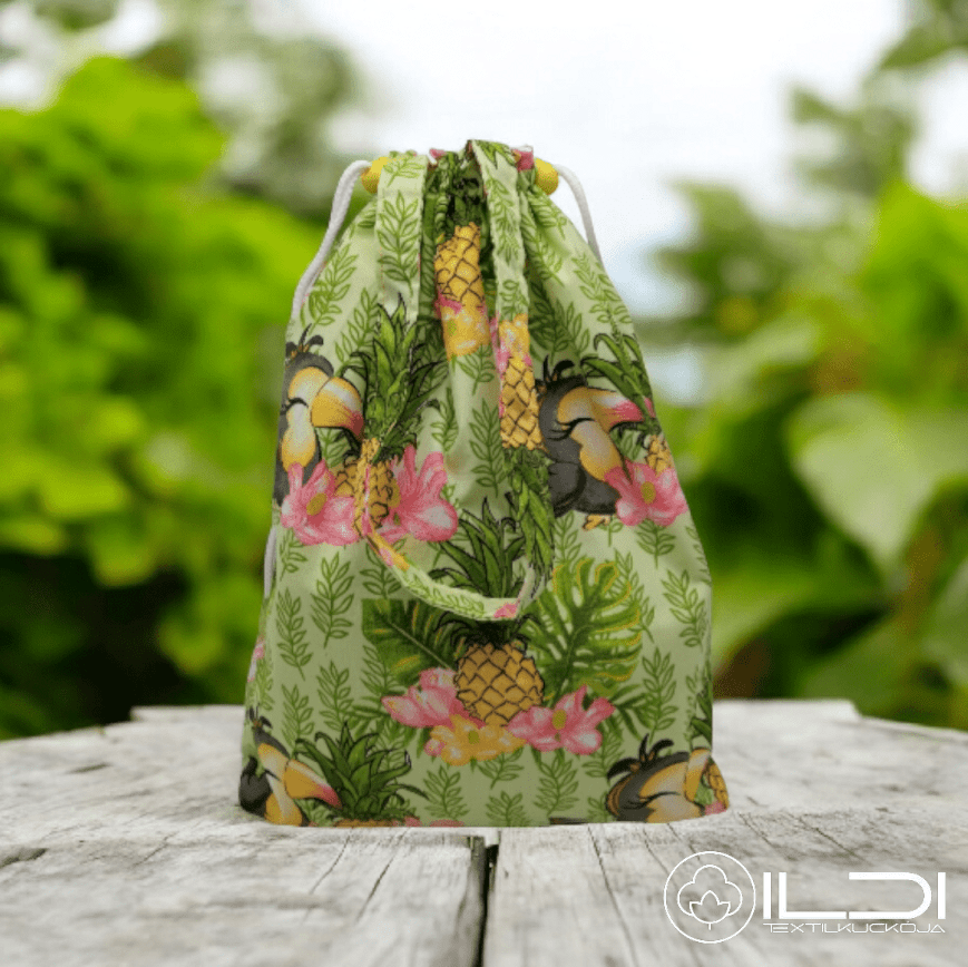 2 rétegből készítettem: egy külső, strapabíró pamut designer vászonból, valamint egy belső, vízlepergető és vízálló PUL anyagból, amely segít bent tartani a nedvességet. Húzózsinórral záródik, így könnyen nyitható és biztonságosan zárható.