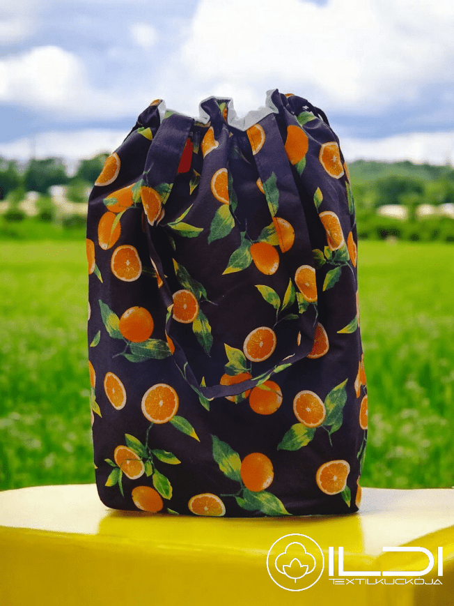 2 rétegből készítettem: egy külső, strapabíró pamut designer vászonból, valamint egy belső, vízlepergető és vízálló PUL anyagból, amely segít bent tartani a nedvességet. Húzózsinórral záródik, így könnyen nyitható és biztonságosan zárható.