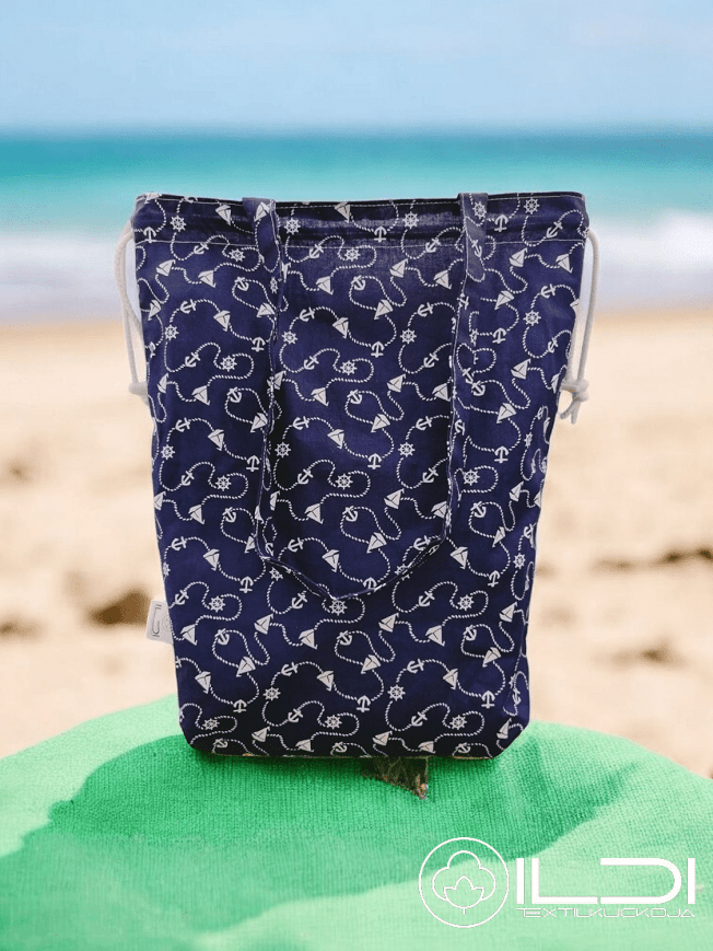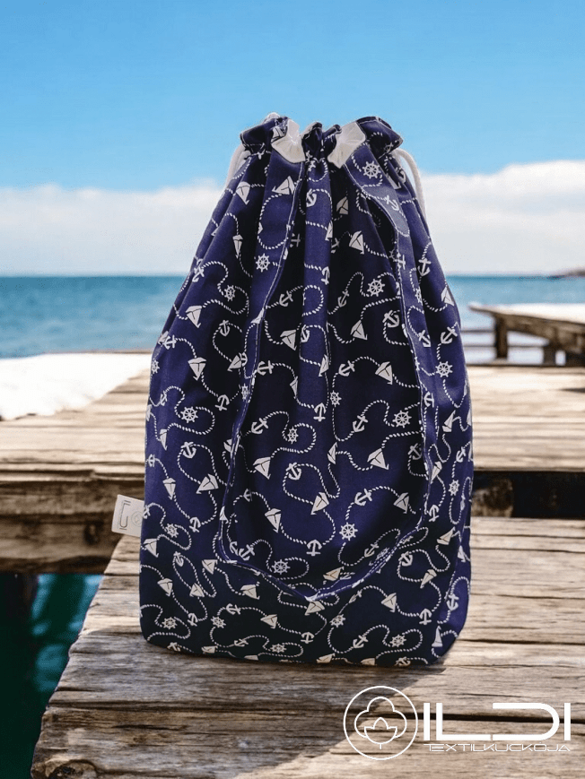 2 rétegből készítettem: egy külső, strapabíró pamut designer vászonból, valamint egy belső, vízlepergető és vízálló PUL anyagból, amely segít bent tartani a nedvességet. Húzózsinórral záródik, így könnyen nyitható és biztonságosan zárható.