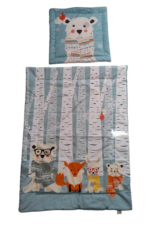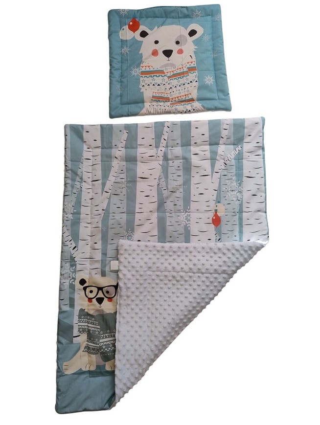 100% pamutvászonból és minky puha plüssös anyagból, közötte vékonyabb vlies anyag.