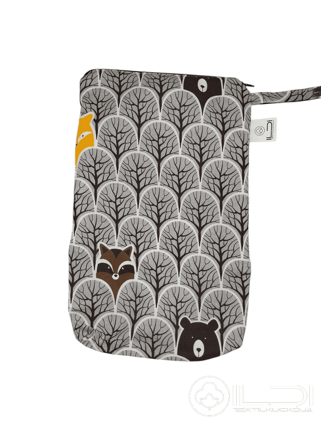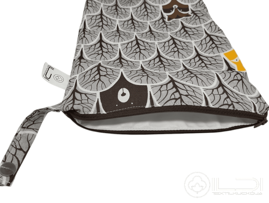 A neszeszer vízhatlan pul béléssel és designer pamutvászonból készül, cipzárral záródik. Egy műanyag patentos akasztója is van, amivel könnyedén a babakocsihoz lehet csatolni.